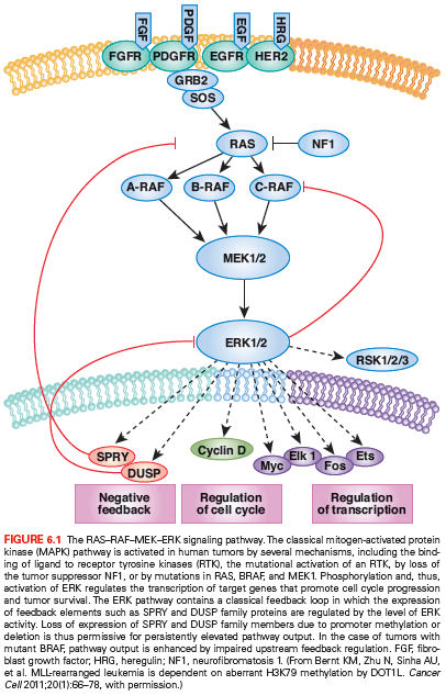 The fact that RAF kinases are intermediate components of the well-characterized RAS/ mitogen-activated protein (MAP) kinase pathway (transducing signals from RAS to RAF to MEK to ERK) raised the possibility that tumors with BRAF mutations might respond to inhibitors of one of these downstream kinases (Fig. 6.1). Preclinical studies revealed that tumor cell lines with BRAF mutation were exquisitely sensitive to inhibitors of the downstream kinase MEK.36 (Sorafenib, in contrast, does not show this profile of activity.37 Thus, proper preclinical screening would have revealed the shortcomings of sorafenib as a BRAF inhibitor.) Curiously, cell lines with a mutation or amplification of EGFR or HER2, which function upstream in the pathway, were insensitive to MEK inhibition. Even tumor lines with RAS mutations were variably sensitive. In short, the preclinical data made a strong case that MEK inhibitors should be effective in BRAF mutant melanoma, but not in other subtypes. The reason that HER2, EGFR, and RAS mutant tumors were not sensitive to MEK inhibitors is explained, at least in part, by the existence of negative feedback loops that modulate the flux of signal transduction through MEK.38