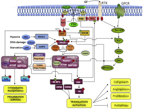 As the biogenesis of proteins is the most energetically expensive process performed by the cell, the activation of the protein synthesis machinery is tightly regulated and perfectly coupled to the availability of nutrients, oxygen, and GFs in the microenvironment. To optimize mTOR activation in response to these biologic conditions, the cell resorts to a coordinated interplay between positive and negative regulators of the molecules that participate in the mTOR pathway, and the activation of intrinsic feedback loops that modulate its function and impose a self-limiting control over its activation.